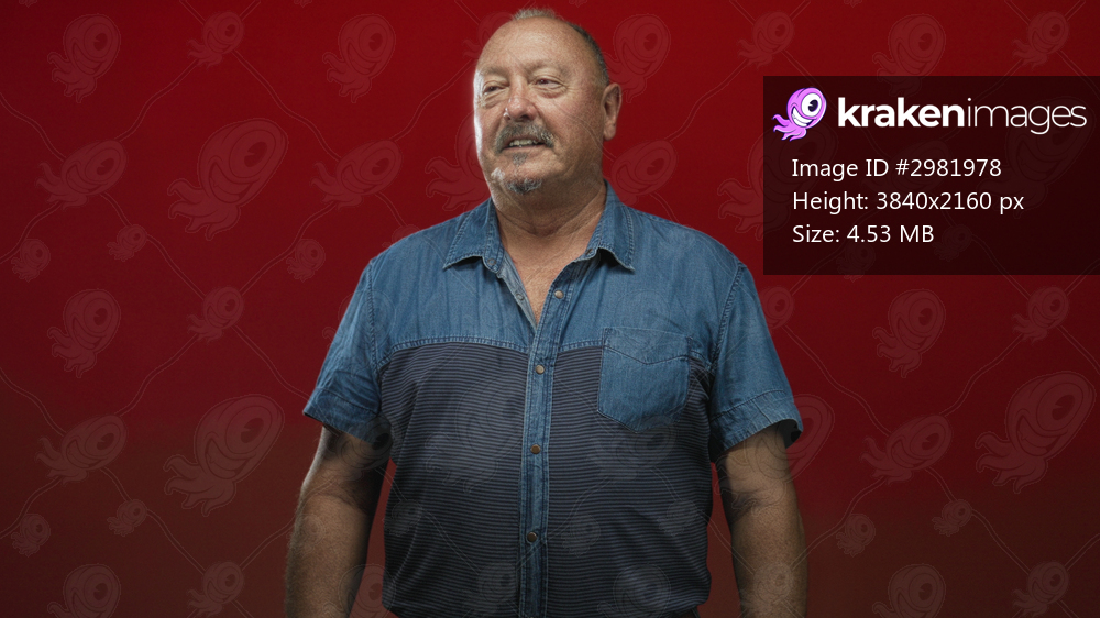 Man smiling with hands at sides wearing denim shirt in studio, facing camera with slight head tilt in front of red seamless backdrop and softbox lighting; warmth confidence authenticity. - Kraken Images