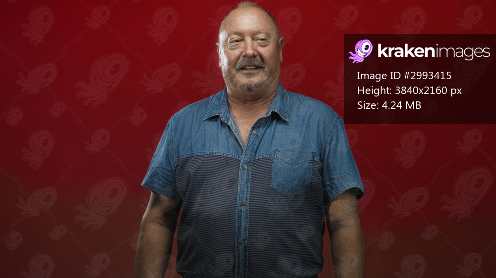 Man smiling with hands at sides wearing denim shirt in studio, facing camera with slight head tilt in front of red seamless backdrop and softbox lighting; warmth confidence authenticity. - Kraken Images