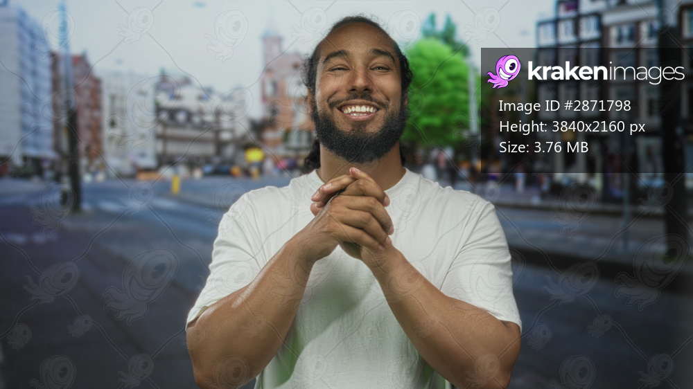 Man smiling with hands clasped at cheek and chin on city street near crosswalk, wearing white t shirt; affection joy.