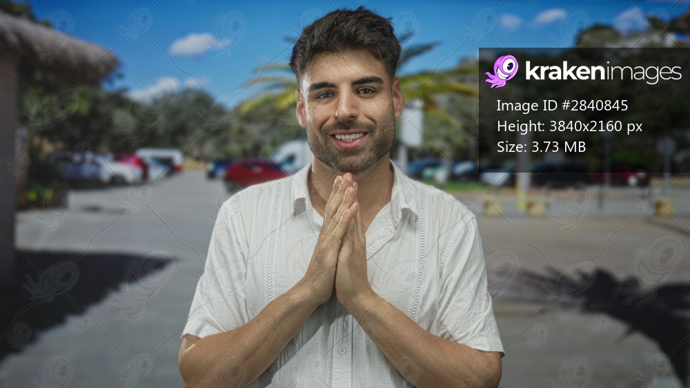 Man smiling with hands clasping gesture standing in white linen shirt on urban street; hopeful prayer.