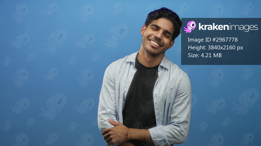 Man smiling with hands folded across torso against blue studio backdrop, eyes partly closed and leaning slightly; calm contentment.