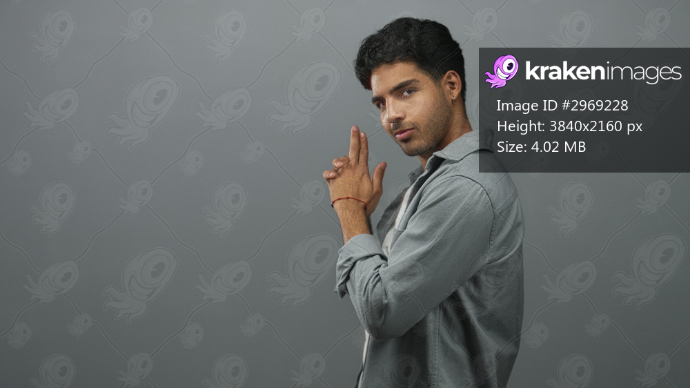 Man smiling, hands forming finger gun and clasping gesture against gray studio backdrop; playful confidence.