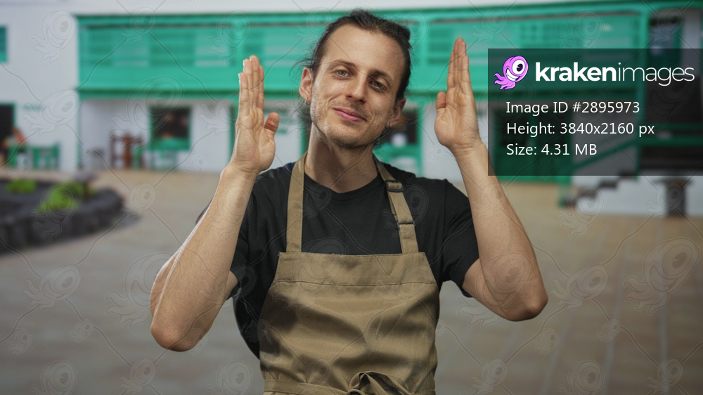Man smiling with hands framing face at building entrance wearing apron and showing forearms; welcoming joy.