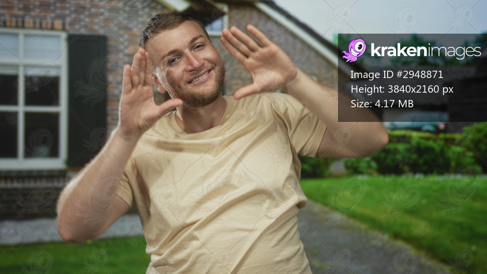 Man smiling with hands framing face in front of building near house doorway, posing outdoors; playful.