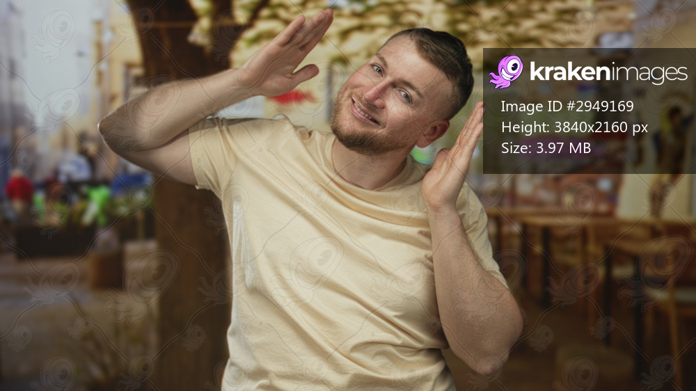 Man smiling with hands framing head on a street cafe terrace under warm sunlight and tree shade; playful moment.