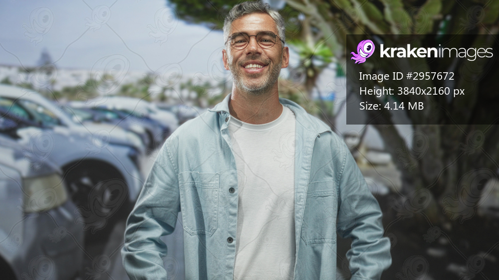 Man smiling with hands giving thumbs up beside parked cars and trees, wearing glasses on street; optimism.