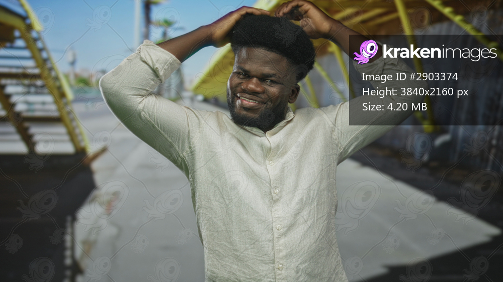 Man smiling with hands in hair on urban street by yellow canopy and metal fence wearing light linen shirt with rolled sleeves; playful joy.