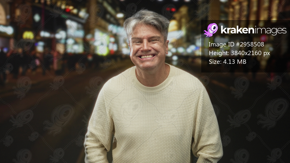 Man smiling with hands in pockets on a busy city street at night, wool sweater and visible teeth, casual posture; contentment.