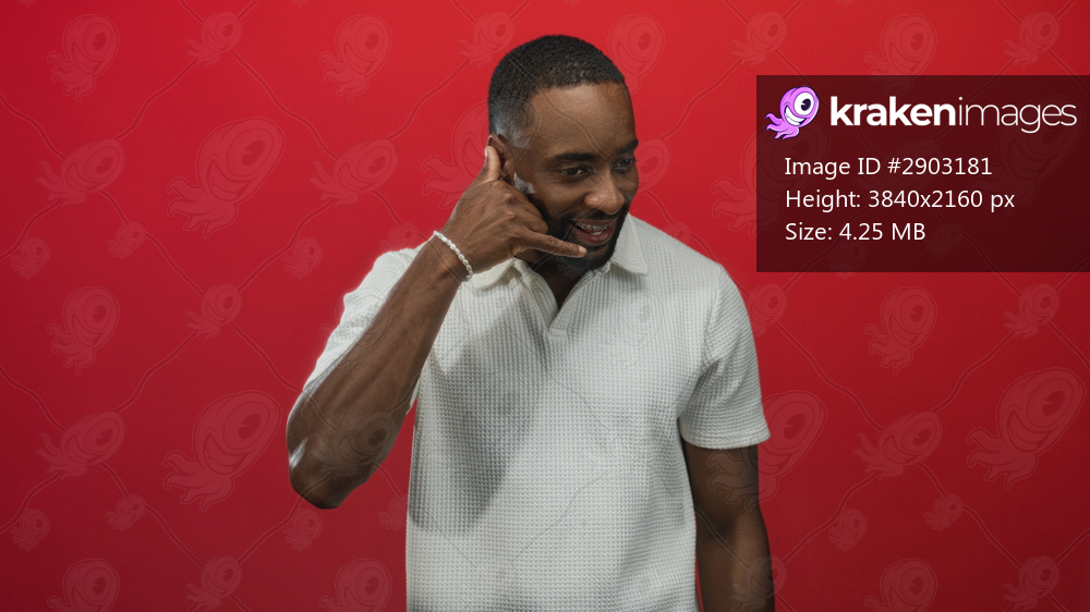 Man smiling with hands making a call gesture and pointing finger at thumb in red studio wearing white polo shirt; playful charm.