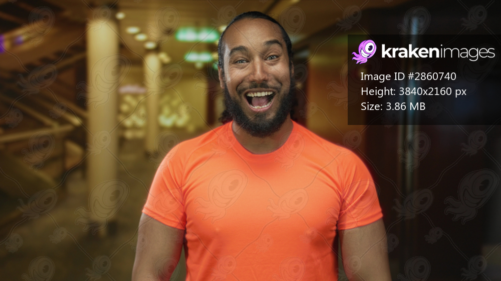 Man smiling with hands on cheeks in hotel building corridor wearing bright orange tshirt and beard facing camera; surprise welcome.
