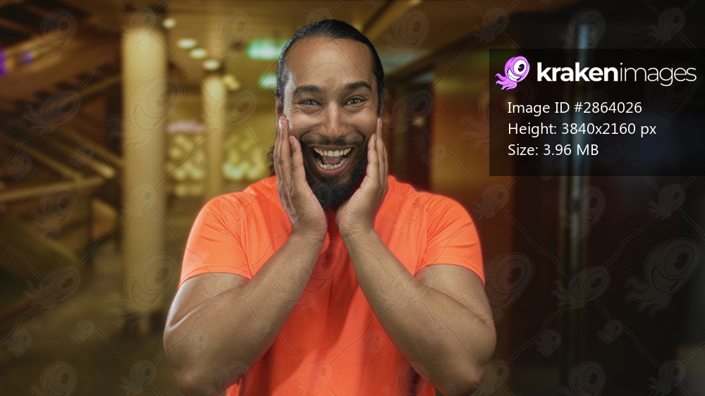 Man smiling with hands on cheeks in hotel building corridor wearing bright orange tshirt and beard facing camera; surprise welcome.