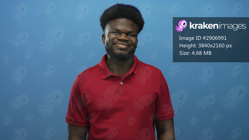 Man smiling with hands on hips wearing red polo shirt against blue wall in studio; confidence friendly warmth.