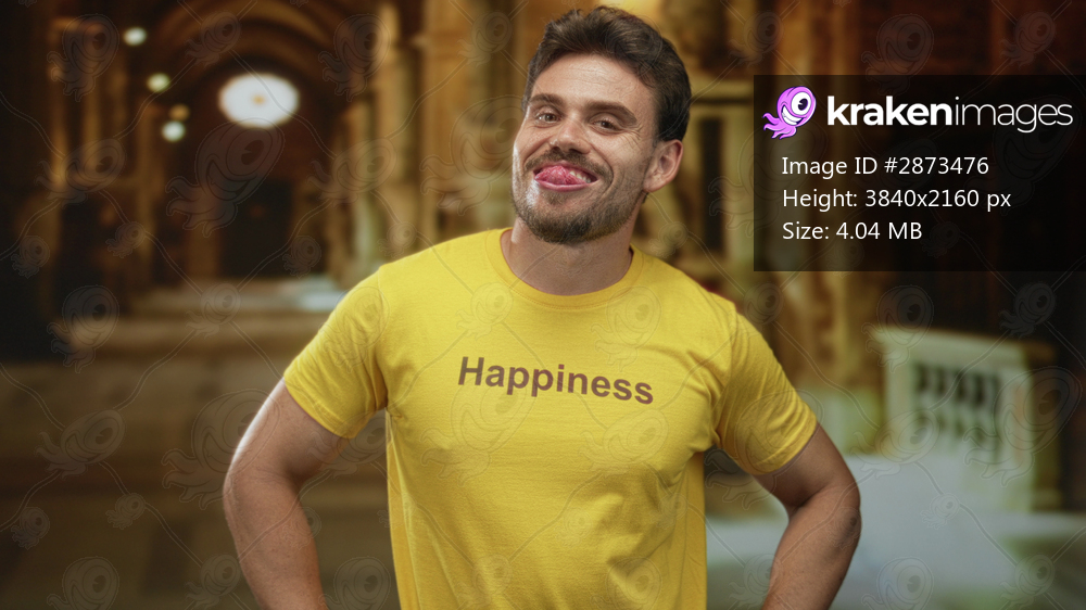 Man smiling with hands on hips wearing yellow tshirt printed with the word happiness in a church aisle with arches and railing; joy.