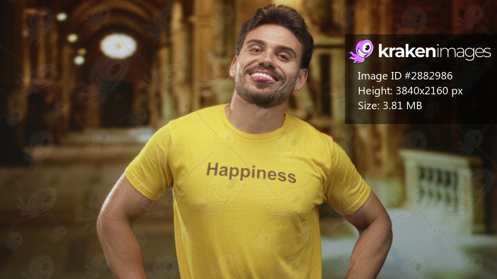Man smiling with hands on hips wearing yellow tshirt printed with the word happiness in a church aisle with arches and railing; joy.