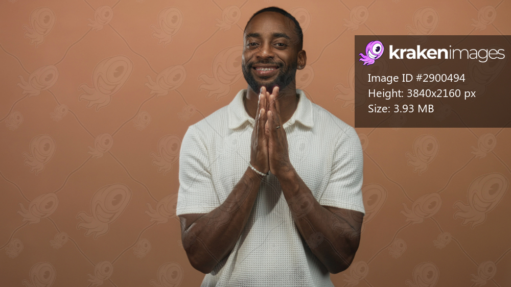 Man smiling with hands pressed together wearing white textured polo and beaded bracelet in peach studio, looking at camera; grateful.