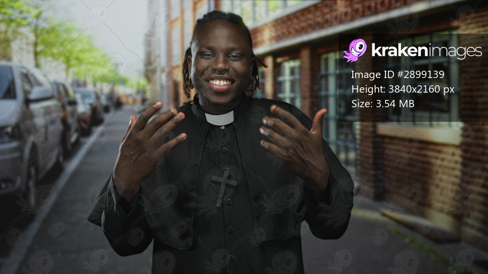 Man smiling with hands raised on a city street in front of a brick building wearing priest collar and cross; joy welcome faith.