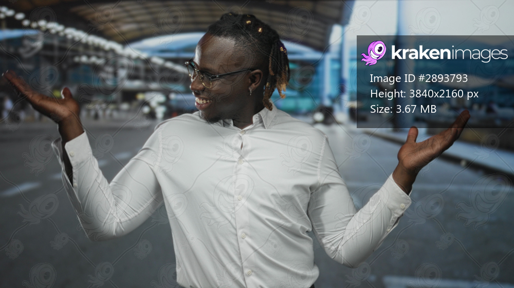 Man smiling with hands raised palms up at airport terminal curbside wearing white shirt and glasses, outdoors near canopy and passenger dropoff; joy.