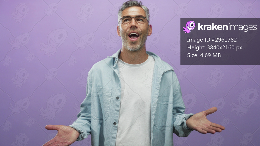 Man smiling with hands raised, palms up and clapping in a purple studio while occasionally touching his face; joy playful.
