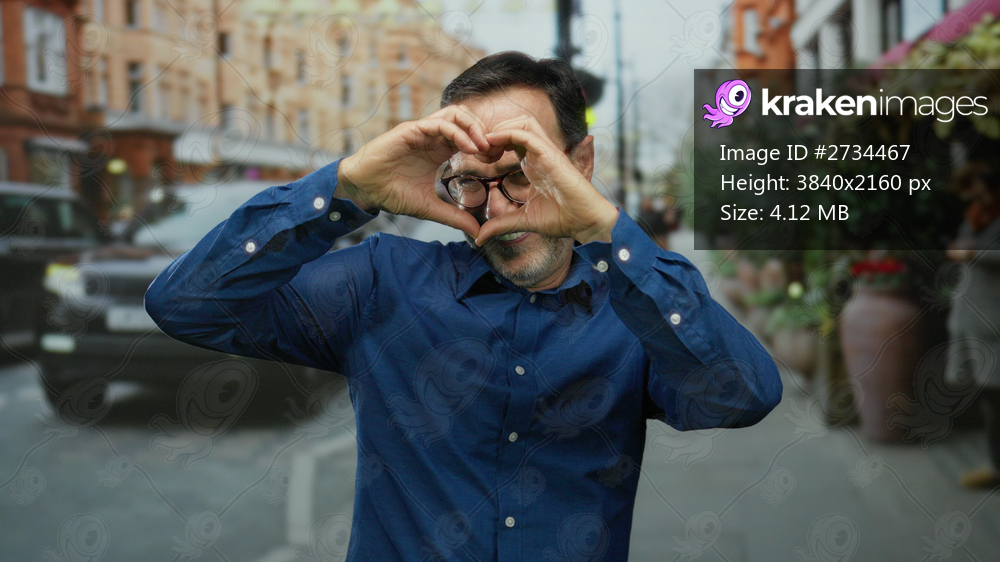 Man smiling heart sign street urban background city mature happy gesture outdoor park hispanic