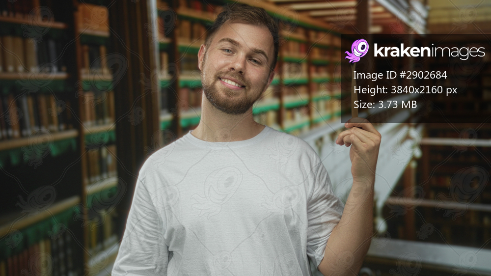 Man smiling holding a bamboo toothbrush up by shoulder in library building aisle wearing white shirt and relaxed pose; friendly contentment.