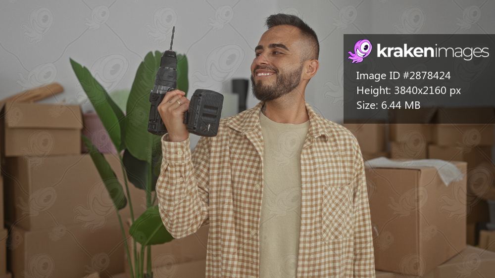 Man smiling and holding a drill with visible hand in a building filled with moving boxes, cardboard and houseplant while wearing flannel shirt; renovation pride. - Kraken Images