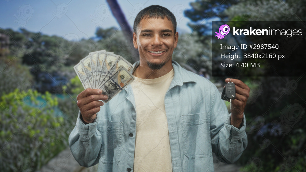 Man smiling holding a fan of cash and car keys in one hand on a forest path with visible hands and a palm tree behind him; financial confidence.