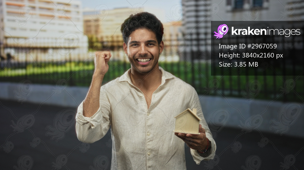 Man smiling, holding a small wooden house model in his hand on a city street with iron fence and buildings visible; pride homeownership.