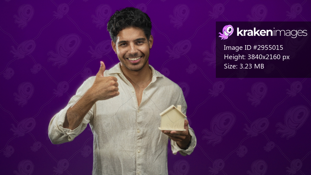 Man smiling, holding a small wooden house model in his right hand and giving a thumbs up with his left in a studio; confidence trust homeownership.