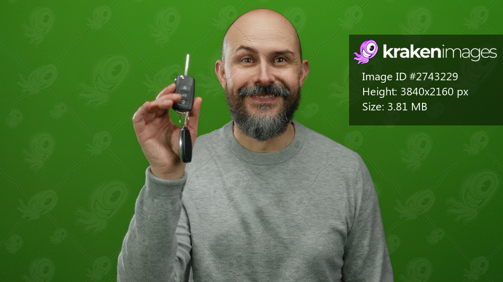 Man smiling holding car keys against a vibrant green background wearing a gray sweater with a beard and bald head, conveying a sense of accomplishment and ownership. - Kraken Images