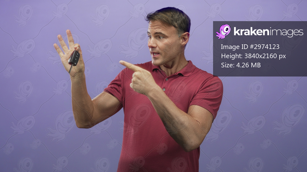 Man smiling, holding car keys in raised right hand and pointing finger at key fob in studio; confidence ownership trust.