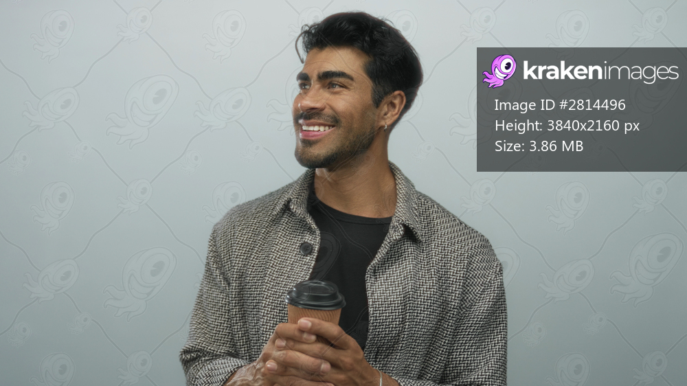 Man smiling and holding coffee cup with both hands in a studio against a pale blue backdrop; happiness.