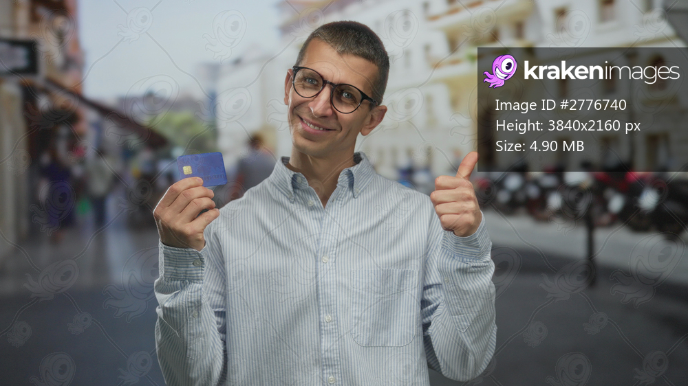 Man smiling holding credit card in outdoor street setting giving thumbs-up conveying financial confidence and positive urban lifestyle gestures.