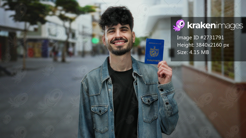 Man smiling holding cuban passport on urban street showcasing travel readiness and identification outdoors with blurred city background.