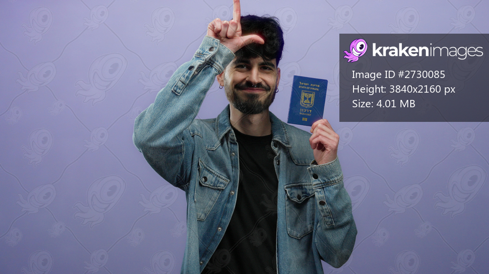 Man smiling holding israeli passport against purple background wearing denim jacket showing travel document.