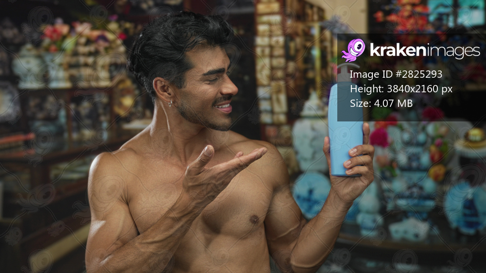 Man smiling and holding lotion bottle near bare chest inside building filled with antique decor; skincare confidence wellness selfcare.