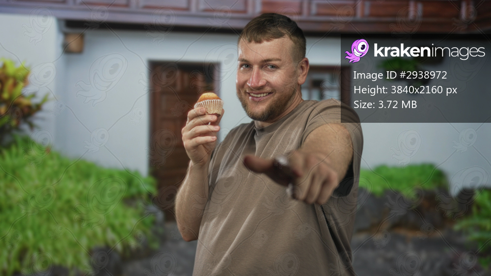 Man smiling, holding muffin with both hands and points finger to camera at a building entrance outdoors; playful welcome.