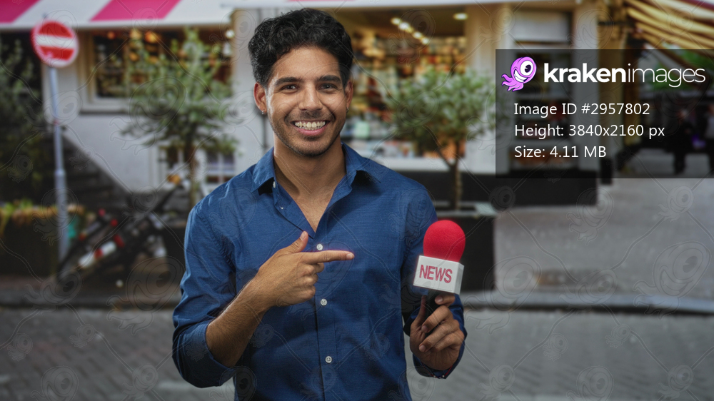 Man smiling and holding news microphone on street, wearing blue shirt with red mic foam and storefront in view; confidence warmth.