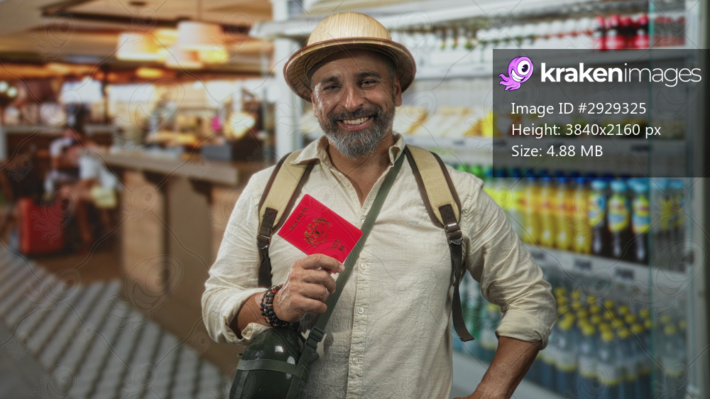 Man smiling holding passport in hand at restaurant counter inside building wearing hat and backpack; travel adventure joy.