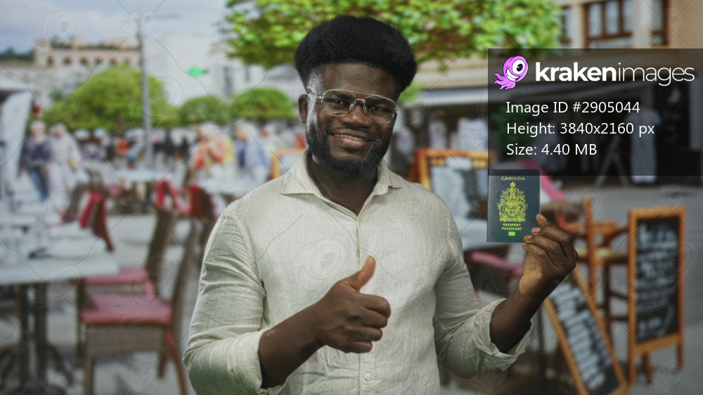 Man smiling and holding passport up with one hand on restaurant terrace by outdoor tables and chalkboard sign; travel pride.