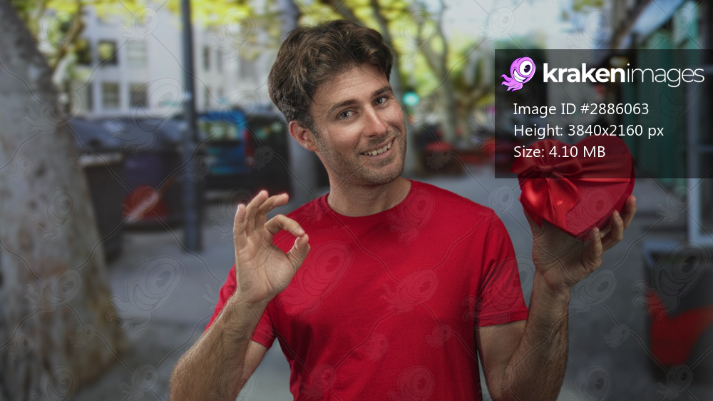 Man smiling holding red heart gift box points finger to heart box on a busy city street; playful romance.
