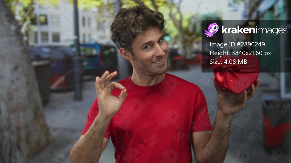 Man smiling holding red heart gift box points finger to heart box on a busy city street; playful romance.
