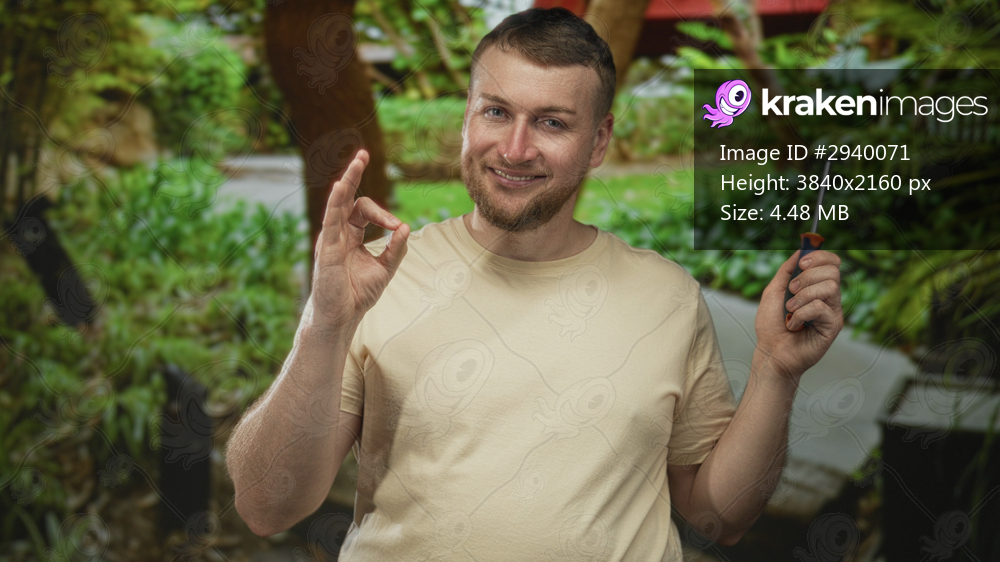 Man smiling holding screwdriver in right hand and making ok sign with left hand in forest; contentment diy repair.