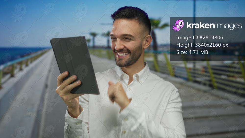 Man smiling holding tablet while on video call at sunny seaside promenade with palm trees and ocean view in background, wearing white shirt and enjoying pleasant outdoor scene. - Kraken Images