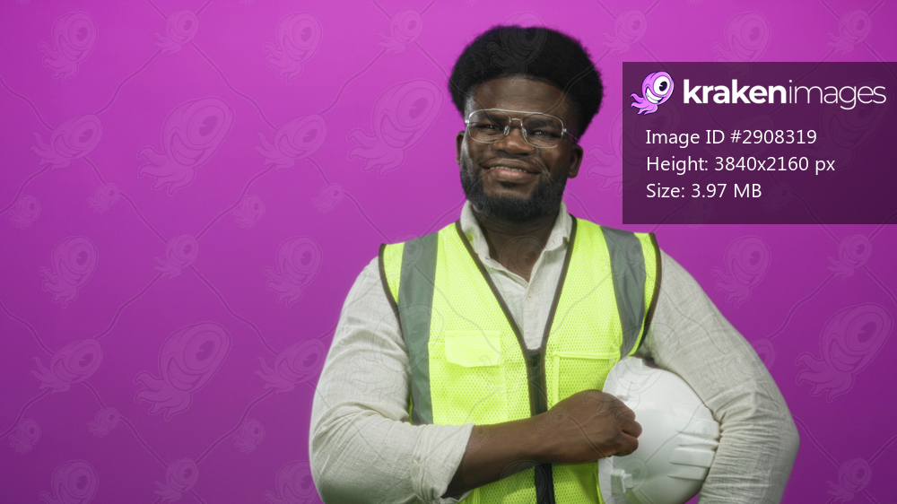 Man smiling and holding white hardhat while wearing a high visibility vest in studio with purple wall; confidence safety skill.