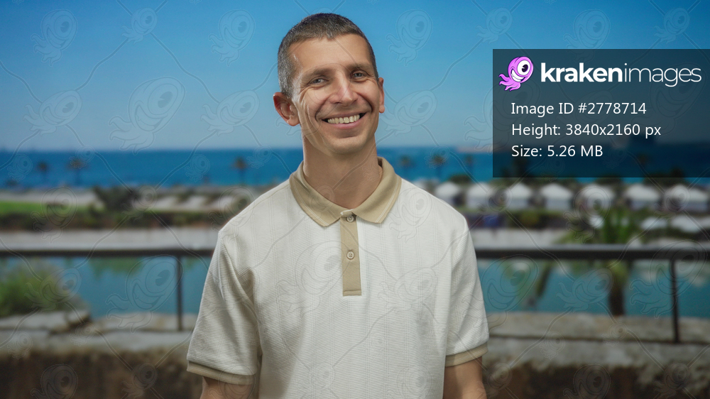 Man smiling in a white shirt stands on a seaside promenade with the ocean and blue sky in the background, capturing a joyful outdoor moment during a sunny day. - Kraken Images