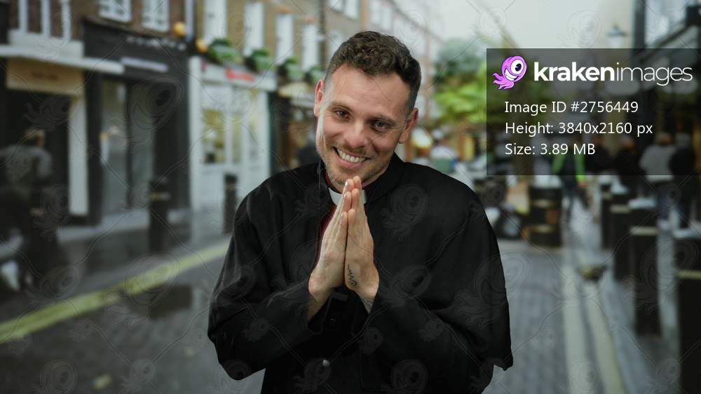 Man smiling in clerical clothing with hands together on urban street with blurred background of city life and pedestrians.