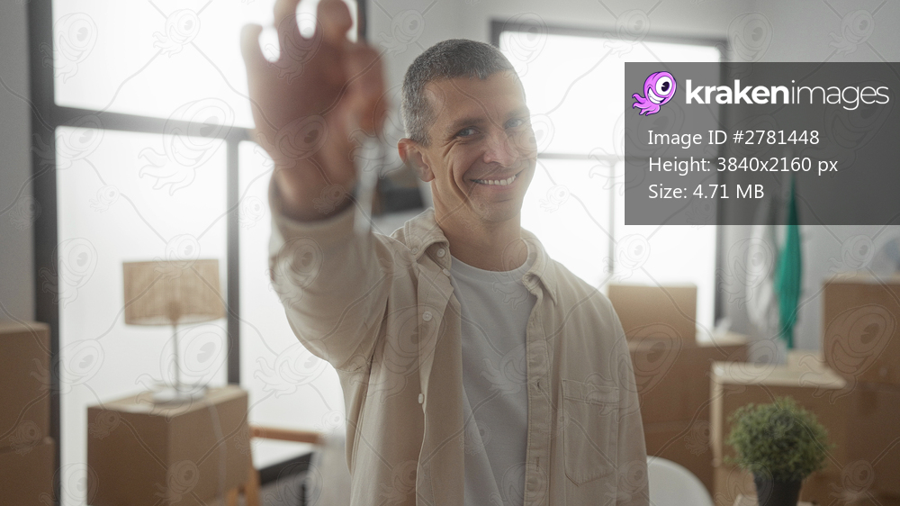 Man smiling in new home with moving boxes holding keys in bright living room implying house purchase and relocation.