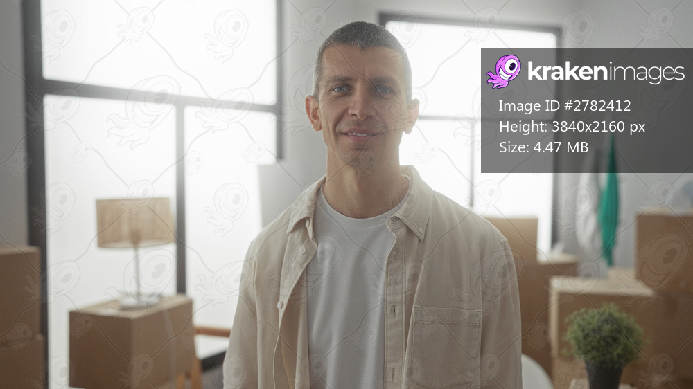 Man smiling in new home with moving boxes holding keys in bright living room implying house purchase and relocation.
