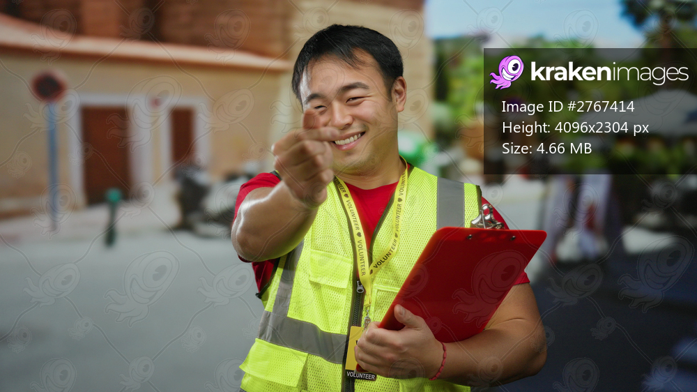Man smiling in outdoor urban setting, making heart gesture with fingers, wearing yellow vest and holding clipboard.