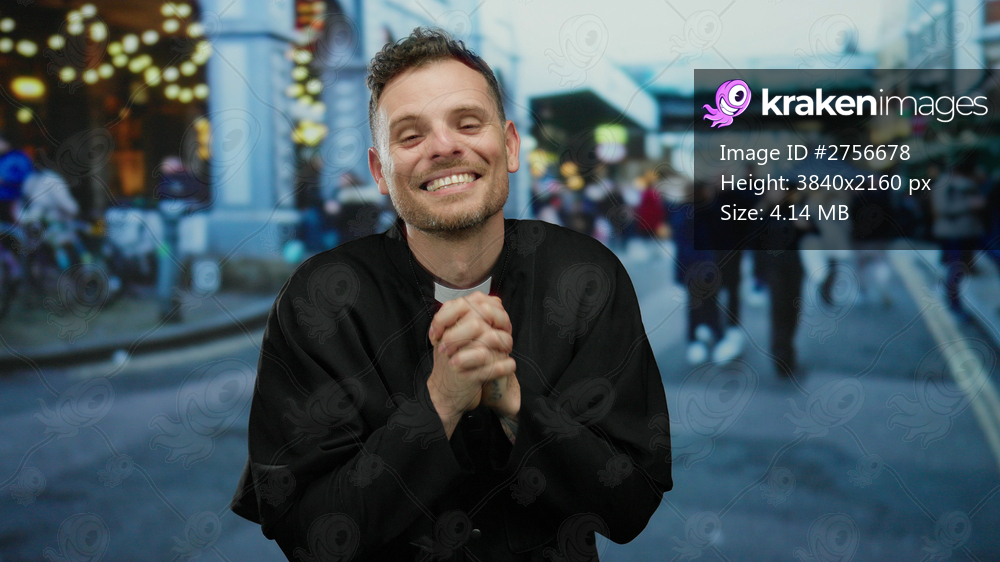 Man smiling in prayerful pose on busy urban street with blurred crowd and festive lights.
